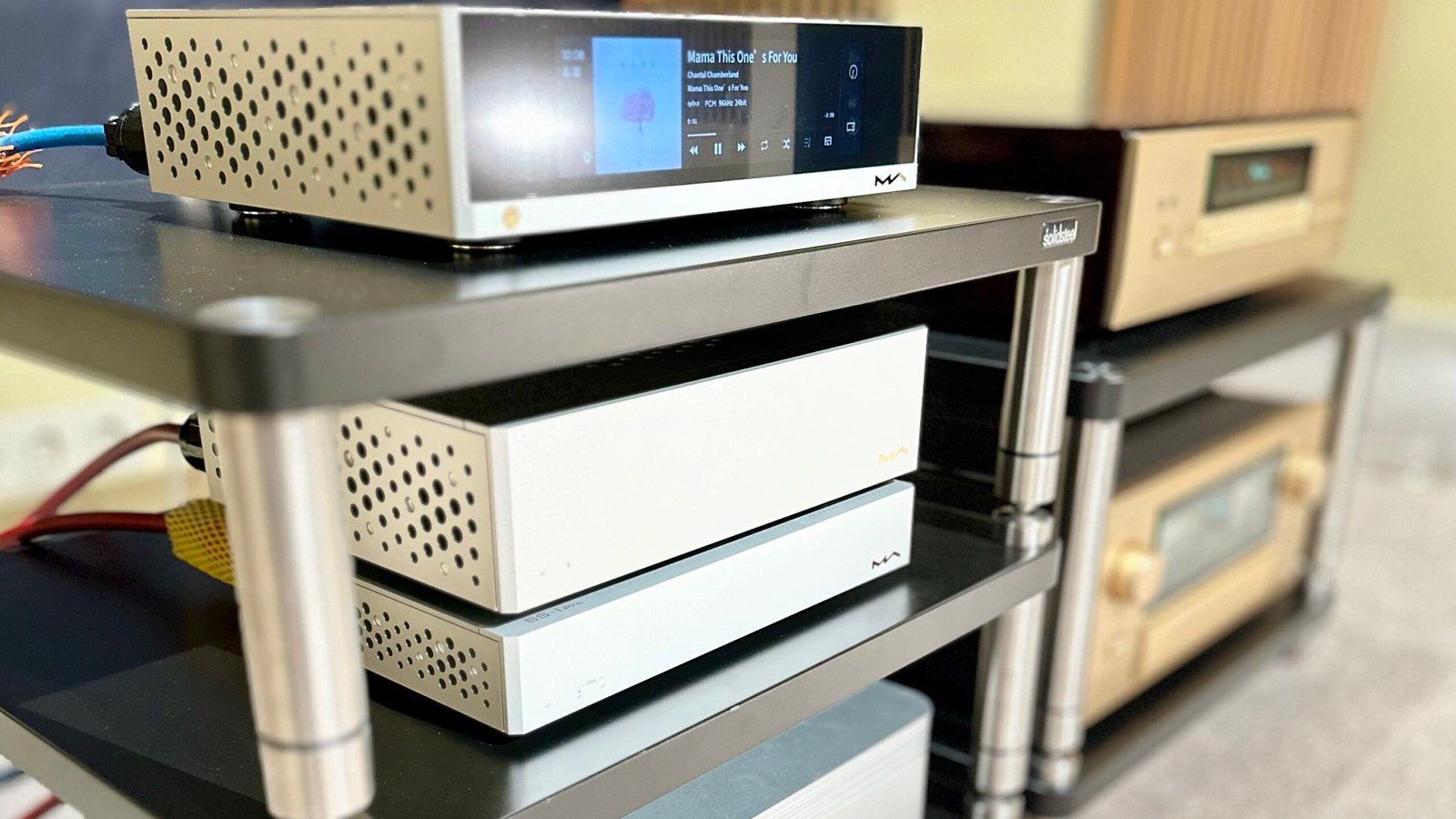 A cadeia completa era uma orquestração meticulosa: amplificação topo de gama Accuphase E-5000, fonte digital a cargo da Matrix com switch SS-1, clock SC-1 e streamer NT-1, conversão pelo DAC integrado no leitor SACD topo de gama da Accuphase, o DP-770, cablagem Crystal Cable, tratamento de corrente IsoTek. Tudo no sítio certo, cada peça a cumprir o seu papel, sem piruetas.